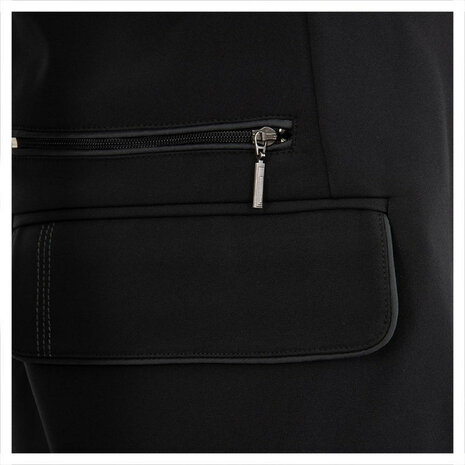 Op het voorpand is de jas voorzien van drie kunststof BR knopen. De manchetten zijn voorzien van dezelfde knopen in een kleiner formaat. De wedstrijdjas bevat twee klepzakken en een ritszak op het voorpand en twee rijsplitten op het achterpand. Een van de klepzakken is voorzien van een geborduurd BR–logo. De belijning en het contraststiksel maken het geheel op elegante wijze af.